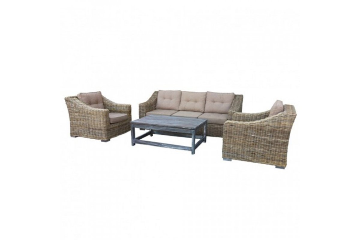 Набор для патио, изготовленный из натурально ротанга, с натуральной отделкой, с деревянным журнальным столиком, а также с подушками на спине каменного цвета. Максимальный вес 350 кг. Страна Индонезия.