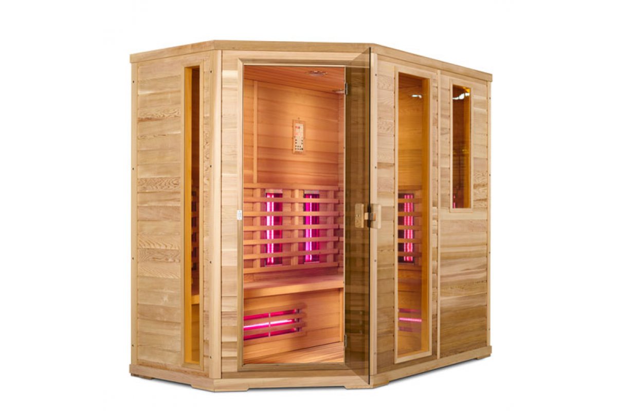 Материал: Хэмлок. В основном произрастает на западе Канады и на Аляске. Хэмлок один из рекордсменов долголетия - его возраст достигает 800 лет и более. Используется как экологически чистый материал для производства оконных рам, саун и паркета. Красивая текстура и малое количества дефектов древесины обусловили широкое применение хэмлока для внутренней и наружной отделки. Древесина канадского хэмлока устойчива к гниению, прочна, тверда и долговечна, поэтому это хороший выбор для домашней инфракрасной сауны. Это натуральное дерево сильно не нагревается при высоких температурах. Древесина очень приятно пахнет натуральным хвойным ароматом и обладает целебными свойствами - получаемые из него эфирные масла широко используются в медицине в качестве обеззараживающего и заживляющего средства.