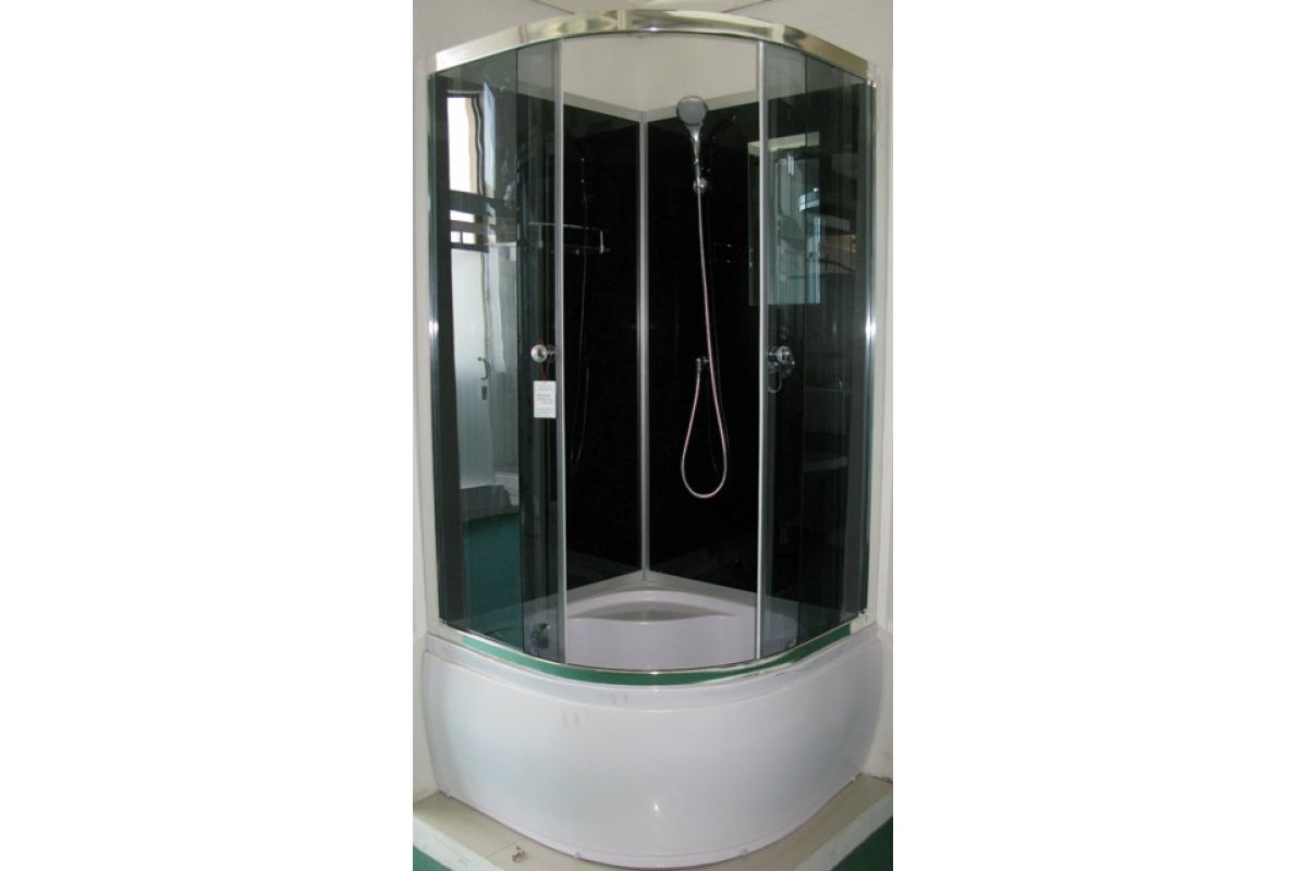 Душевая кабина, высокий поддон с сиденьем (46 см), лейка, без крыши, стекло тонированное, зеркало, стеклянная полочка.