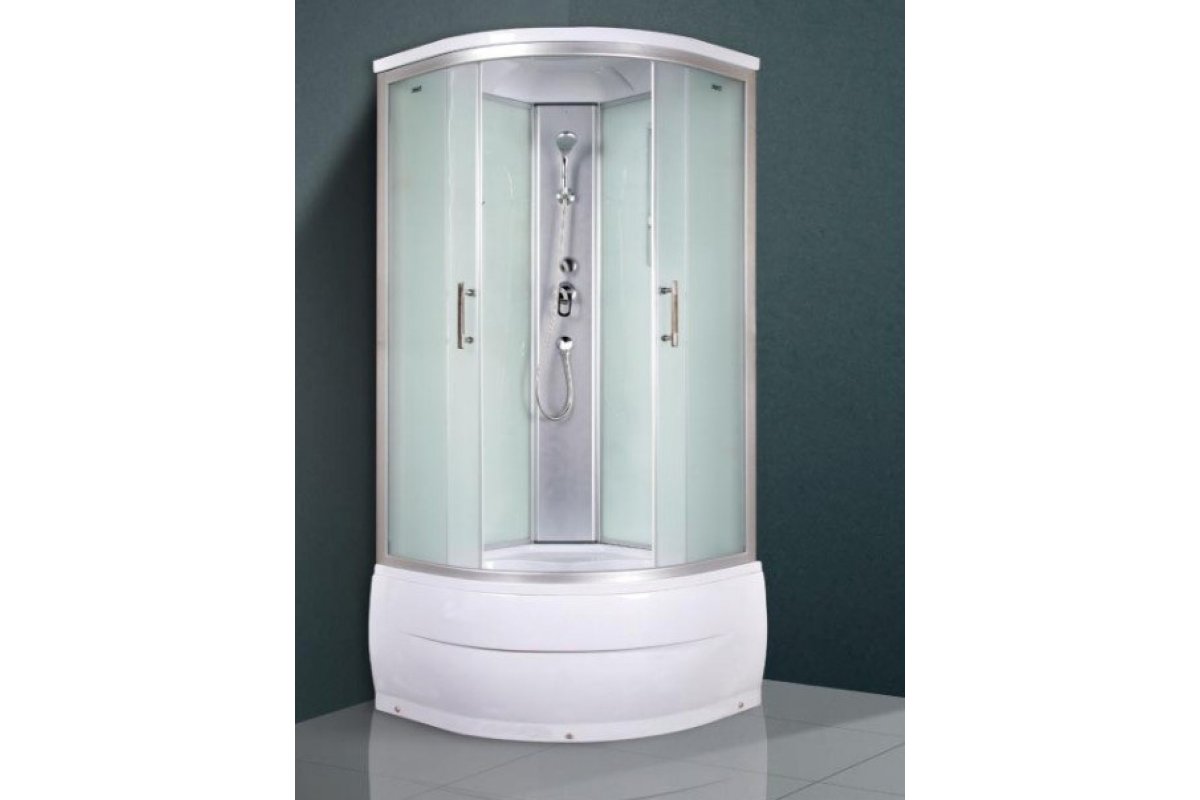 Стекло матовое, средний поддон с сиденьем (50 см), верхний душ, лейка, полка, зеркало, смеситель, задняя стенка из белого стекла, переключатель воды.