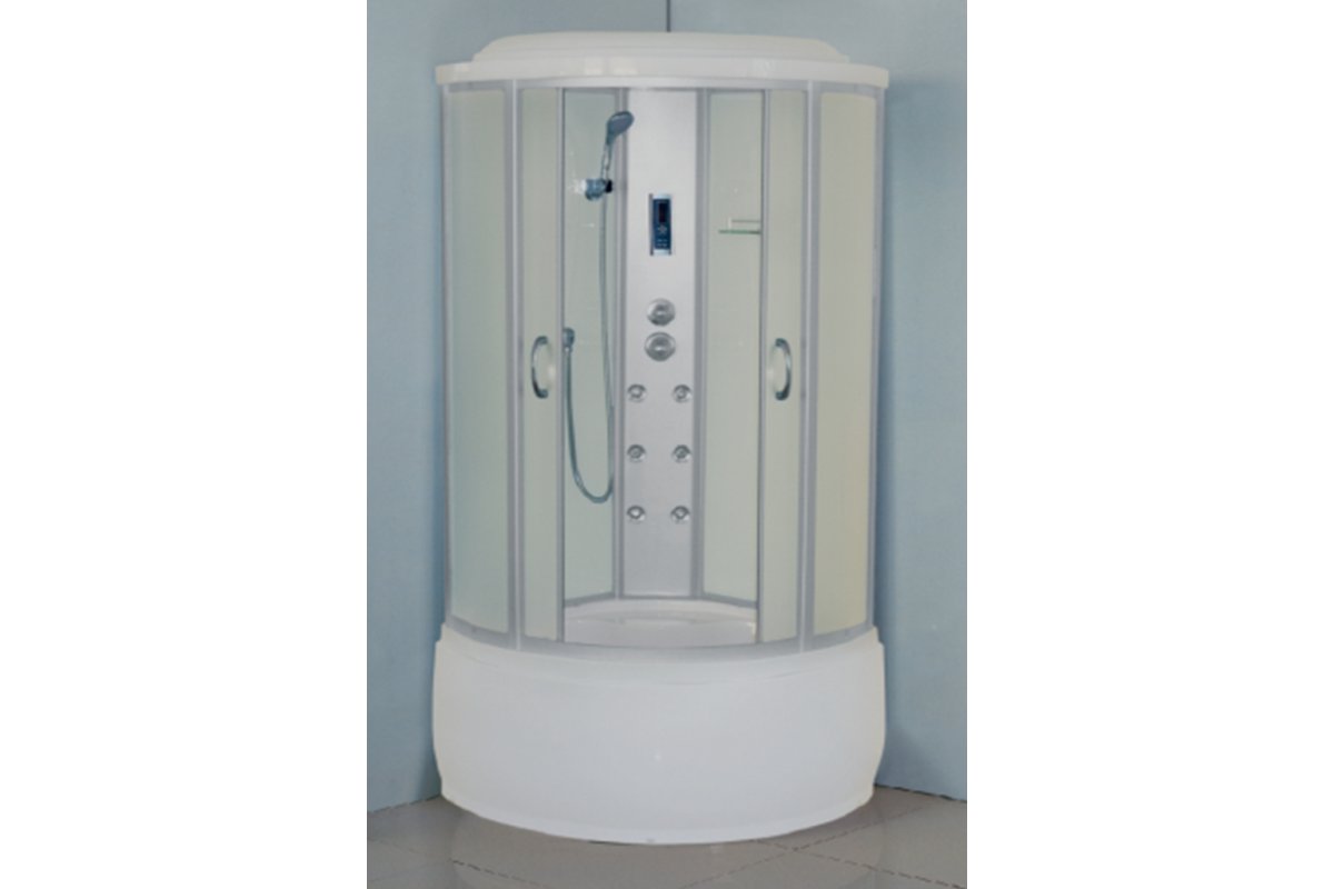 Стекло трикотаж, лейка, гидромассаж, полка, зеркало, смеситель, переключатель воды, свет, радио, задняя стенка из белого стекла, высокий поддон (50 см), верхний душ, вентиляция, пульт управления.