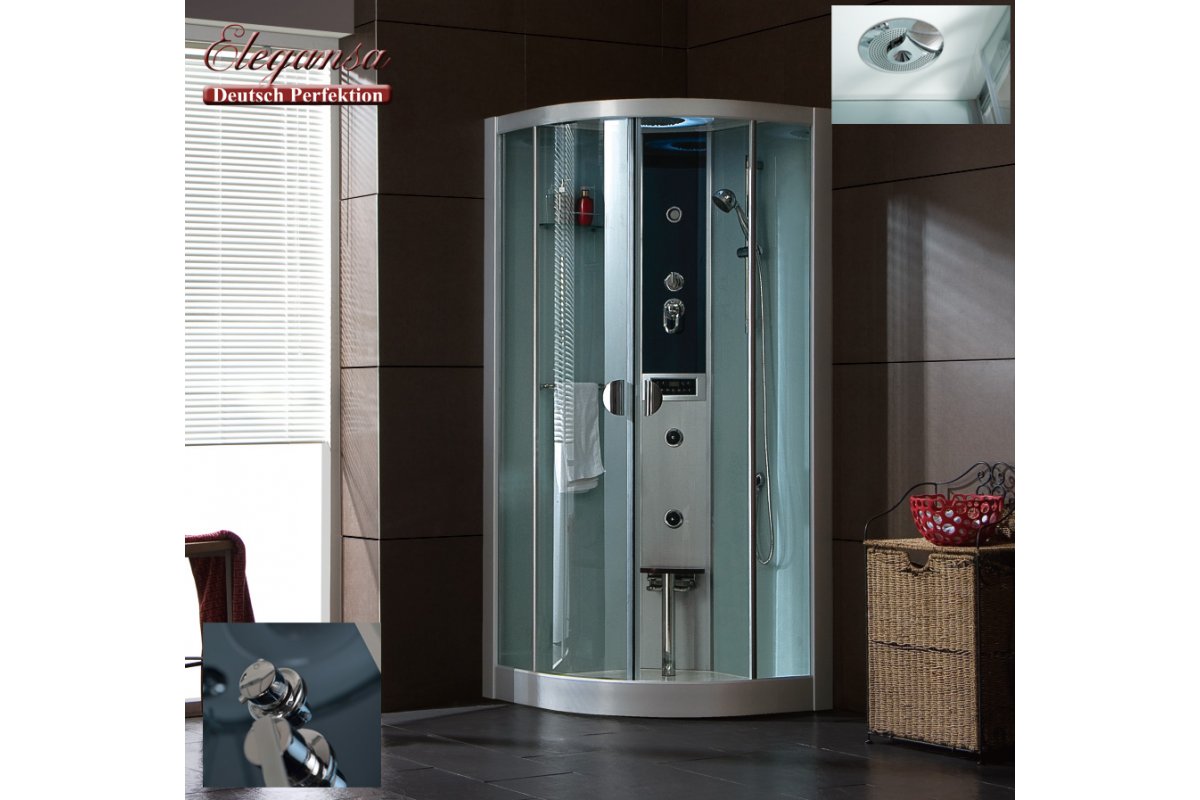 Функция: пар, сенсорный пульт, радио FM, вентилятор, верхний свет, душевая лейка на стойке, ручной душ, две форсунки, держатель полотенца, стеклянная полка, ручки латунь-хром, ролики двойные металлические. Паровая кабина с двумя раздвижными дверьми, поддон акриловый с усиленным каркасом и сифоном, с алюминиевым плинтусом, задняя стеклянная панель, складывающееся сиденье.