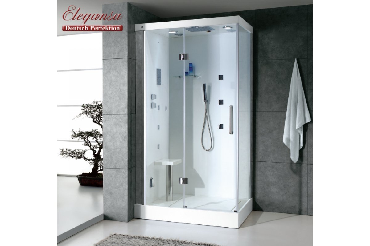 Задняя стеклянная панель, паровая кабина с одной дверцей, сиденье. Функция: пара, радио, верхний свет, душевая лейка, подключение MP3, вентилятор, форсунки, ручной душ.