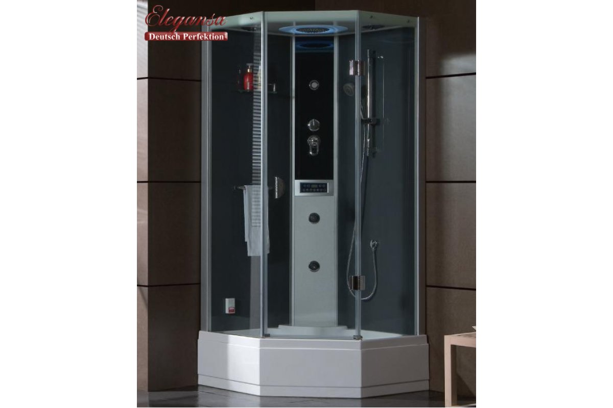 Паровая кабина с распашной дверью, задняя стеклянная панель, высокий поддон акриловый с усиленным каркасом и сифоном, с алюминиевым плинтусом. Функция: пар, верхний свет, душевая лейка на стойке, ручной душ, две форсунки, сенсорный пульт, радио FM, вентилятор, держатель полотенца, стеклянная полка, ручки латунь-хром, ролики двойные металлические.