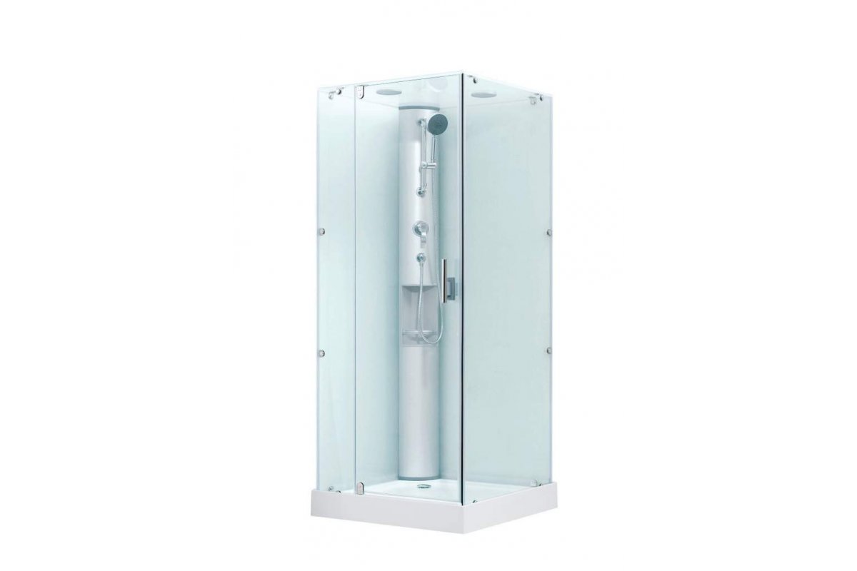 Душевая кабина 800 х 800 квадратная с распашной дверью, без пара и без гидромассажа. Передние стенки – прозрачные, задние – матовые, толщина закаленных стекол – 6 мм. Дверь кабины распашная, на специальных крепежах из хромированного алюминия. Смеситель, полочки для мыла и шампуня, душевой гарнитур. Низкий акриловый поддон с регулируемыми ножками.