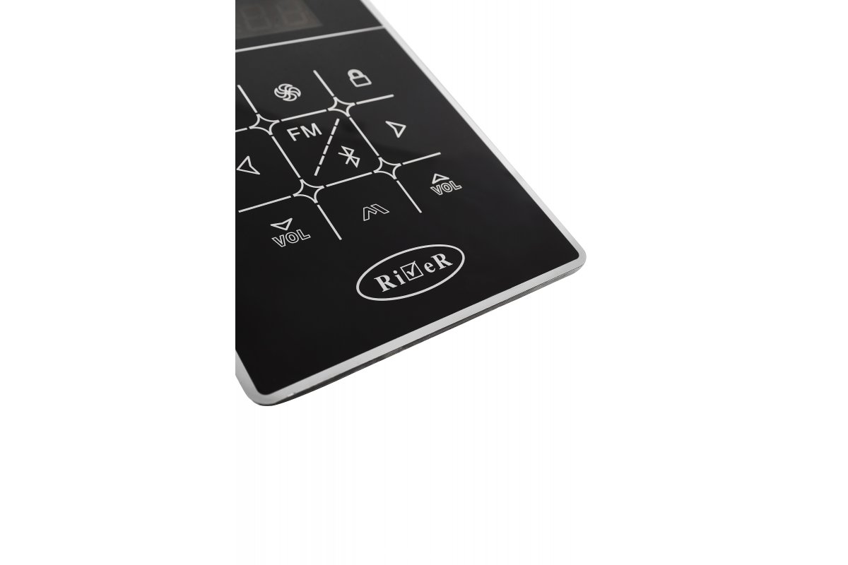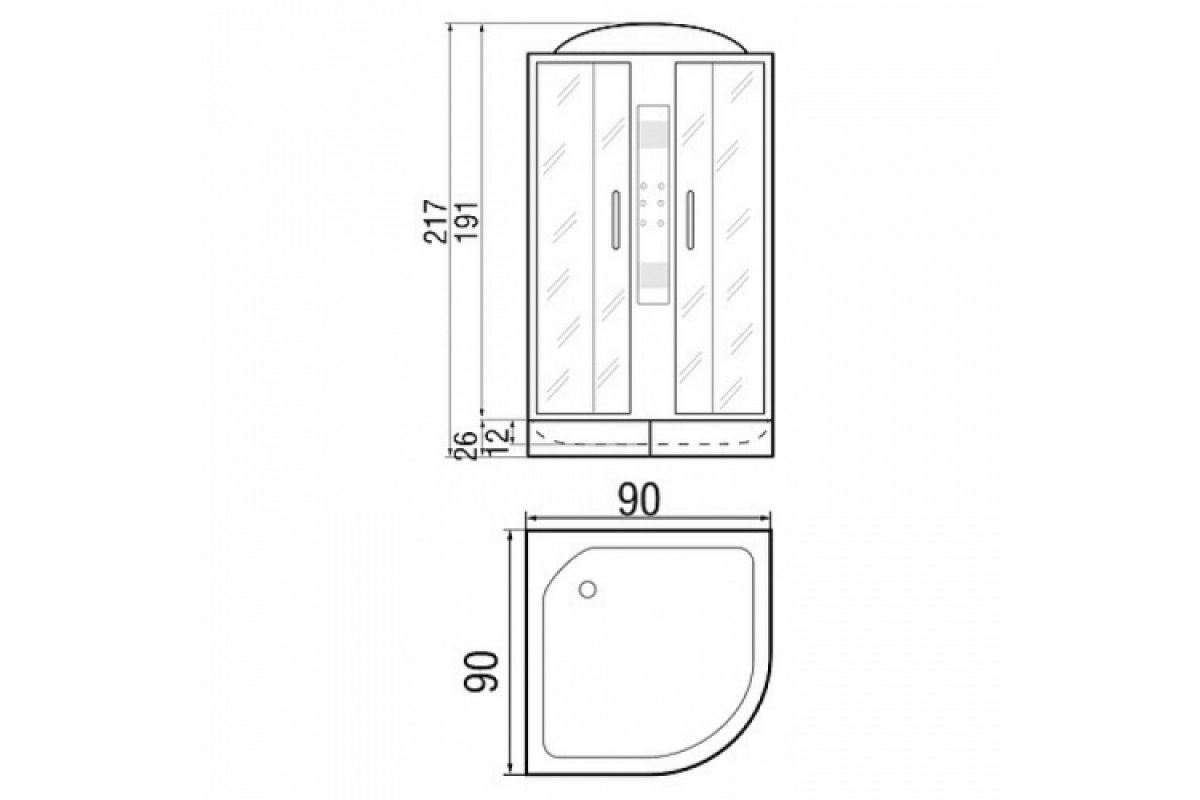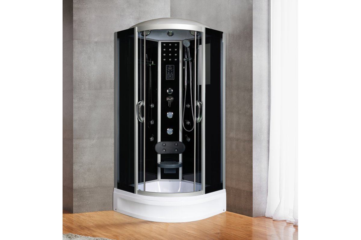 Крыша,верхний душ, верх.свет, декор.подсв, центр.стойка стеклянная, динамик, вентилятор, пульт упр-я, радио, телефон, 8 г\м форсунок, 4 г\м форсунки поясница, руч.душ 3х режимный, смеситель, переключатель режимов, зеркало, полка, вешалка, штанга, сиденье откидное, стекло матовое или тонированное.