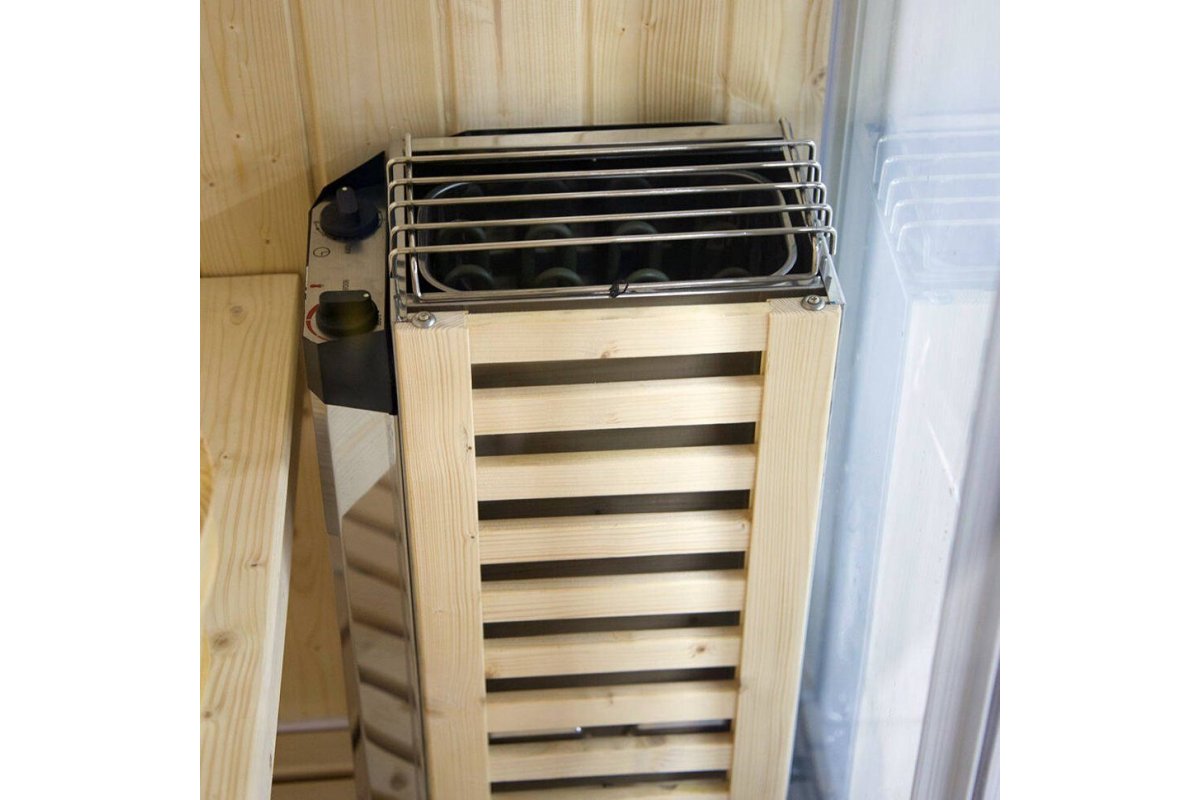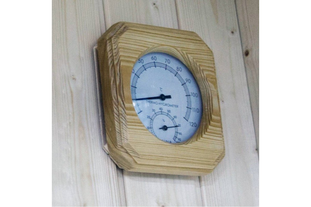 Сауна из натурального дерева, печь, гигротермограф температуры и влажности, деревянная скамейка, деревянное ведро и ложка, песочные часы