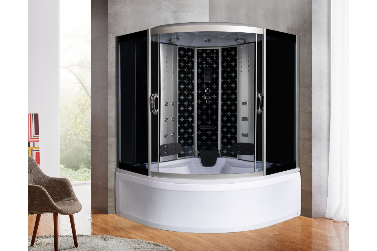 Крыша, верхний душ cо светом, декор.подсв. на 3-х тойках, 1 цент.стойка зеркальная, 2 цент.стойки, ABS, динамик, вентилятор, панель упр-я, радио, телефон, 15 г/м форс., 4 г/м форс. д/поясничка, руч.душ на штанге, смеситель с переключ-ль режимов, 2 подгол. на. липучке, откидной подголов. на металл. стойках, зеркало, 2-х ярус. полка, кноп. ролики