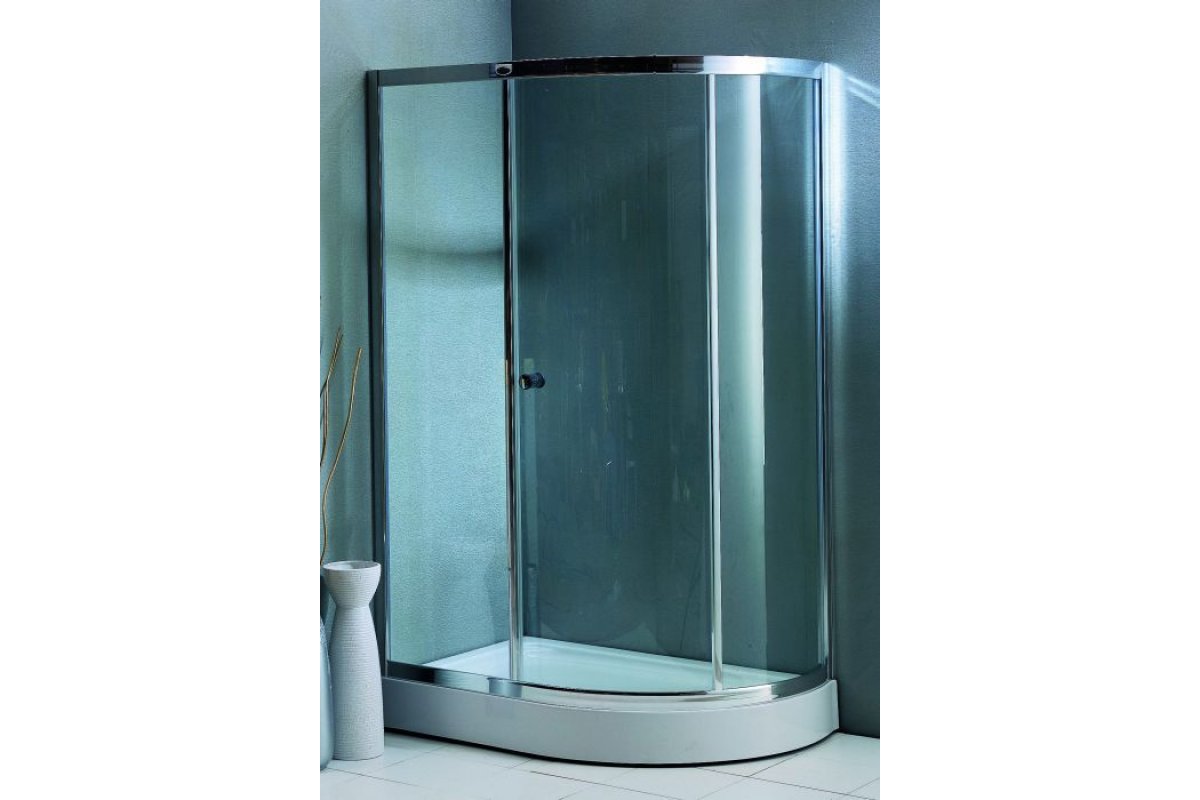 Душевое ограждение, угловое, двери раздвижные, закаленное прозрачное стекло толщиной 6мм, полированный алюмиевый профиль, хромированная ручка, акриловый поддон.