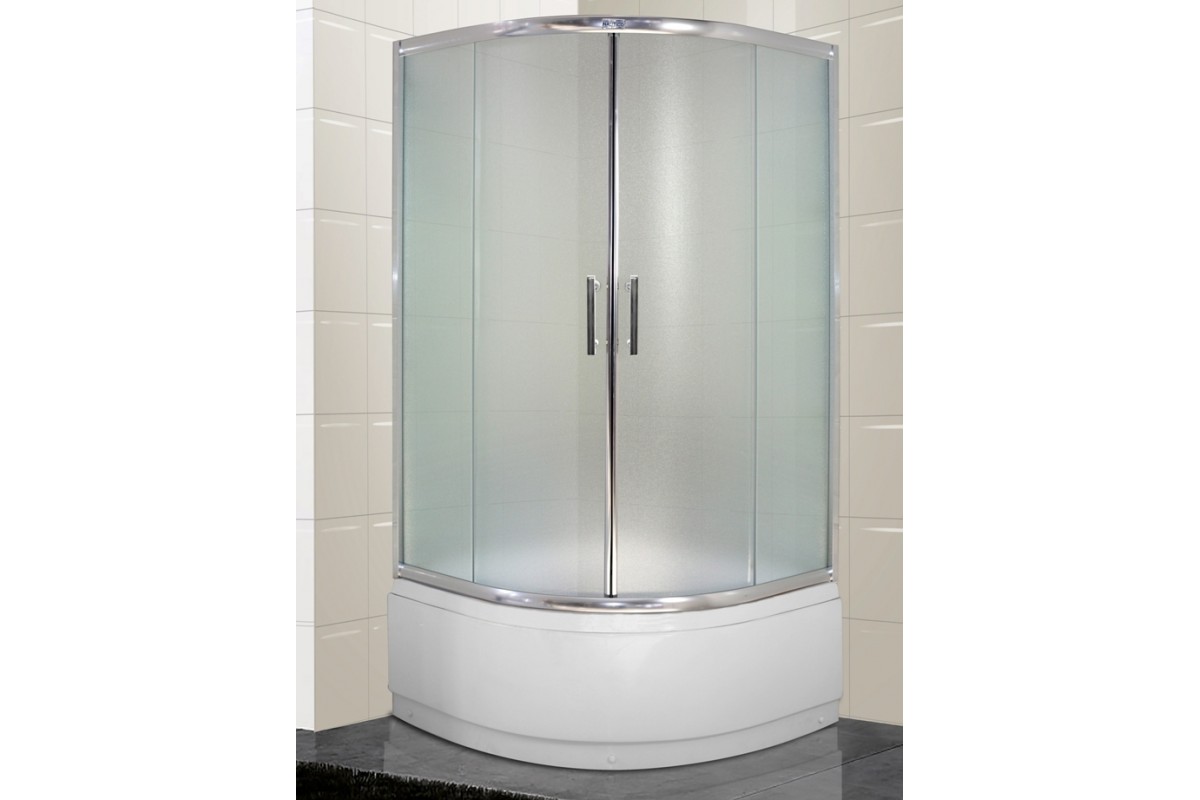 Высокий поддон; сифон с гидрозатвором; алюминиевый профиль, цвет: "глянцевый хром", стекло толщиной 5 мм, фактура: "мороз", двойные верхние ролики, регулировочный пристенный профиль.