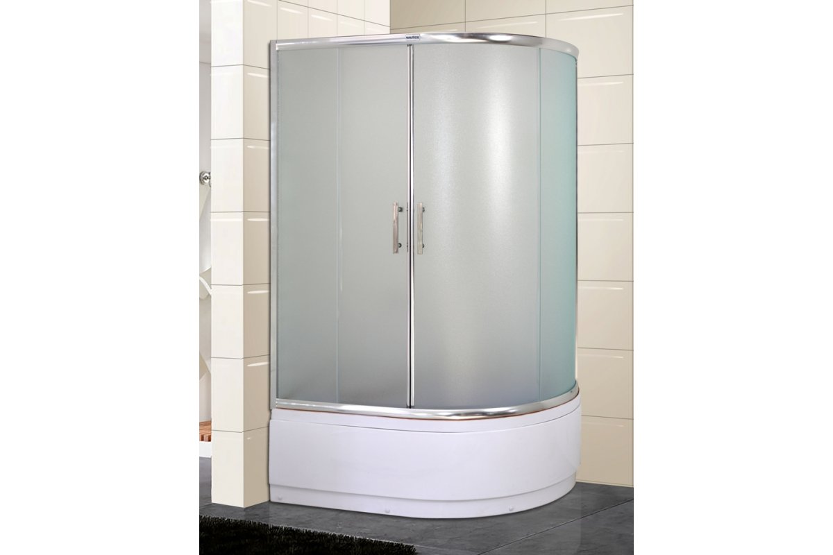 Высокий поддон; сифон с гидрозатвором; алюминиевый профиль, цвет: "глянцевый хром", стекло толщиной 5 мм, фактура: "мороз", двойные верхние ролики, регулировочный пристенный профиль.