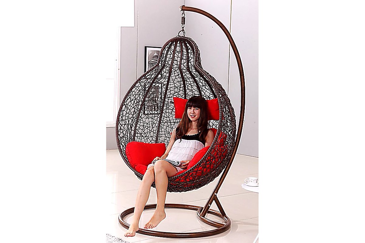 Кресло-качели на стальной штанге с плетеной корзиной из искусственного ротанга.