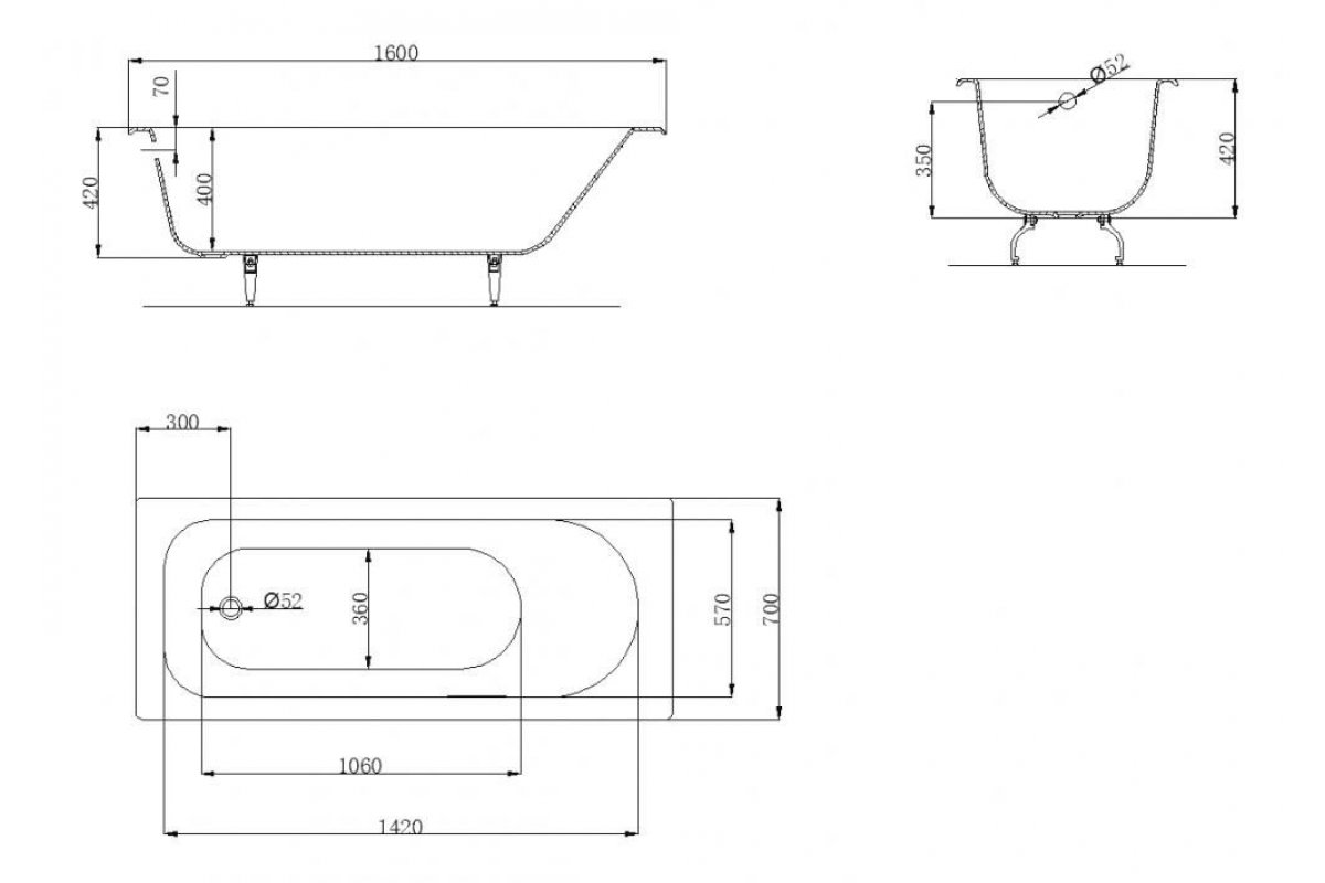 Ванна чугунная OWLIB191101 Роксен 1600*700 б/п, без ручек, ножки в комплекте