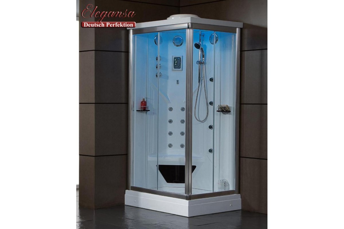 Паровая кабина с одной дверью (раздвижная), поддон акриловый усиленный. Функция: пар, вентилятор, верхний свет, душевая лейка на штанге, ароматерапия, радио FM, сенсорный пульт, ручной душ, восемь форсунок, две стеклянных полки,
