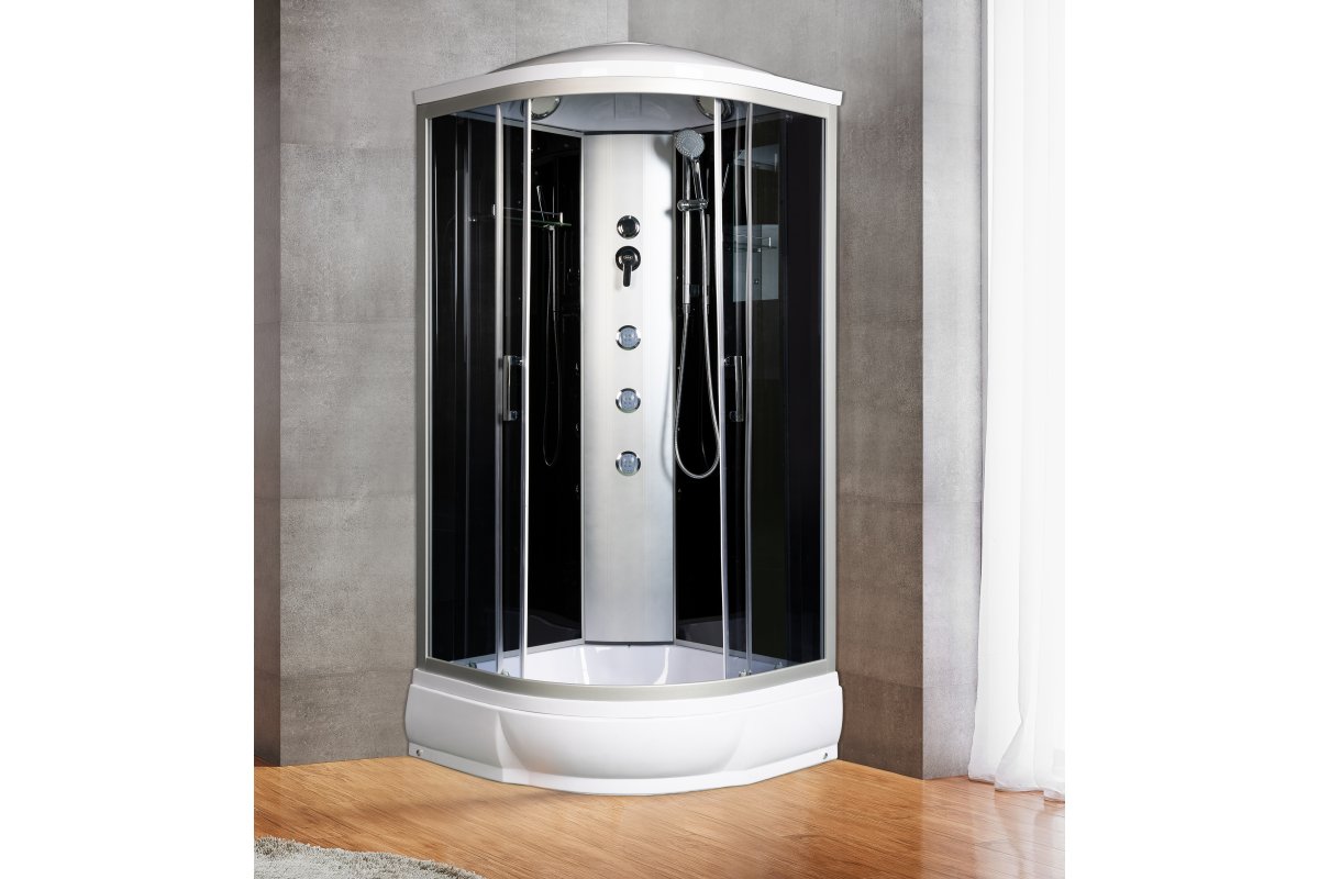 Крыша, верхний душ, штанга, ручной душ 3х режим, смеситель с переключ.режимов, г\м 3 форсунки, вентиляц.отв-я 2шт, зеркало, полочка, вешалка, матовое стекло.
