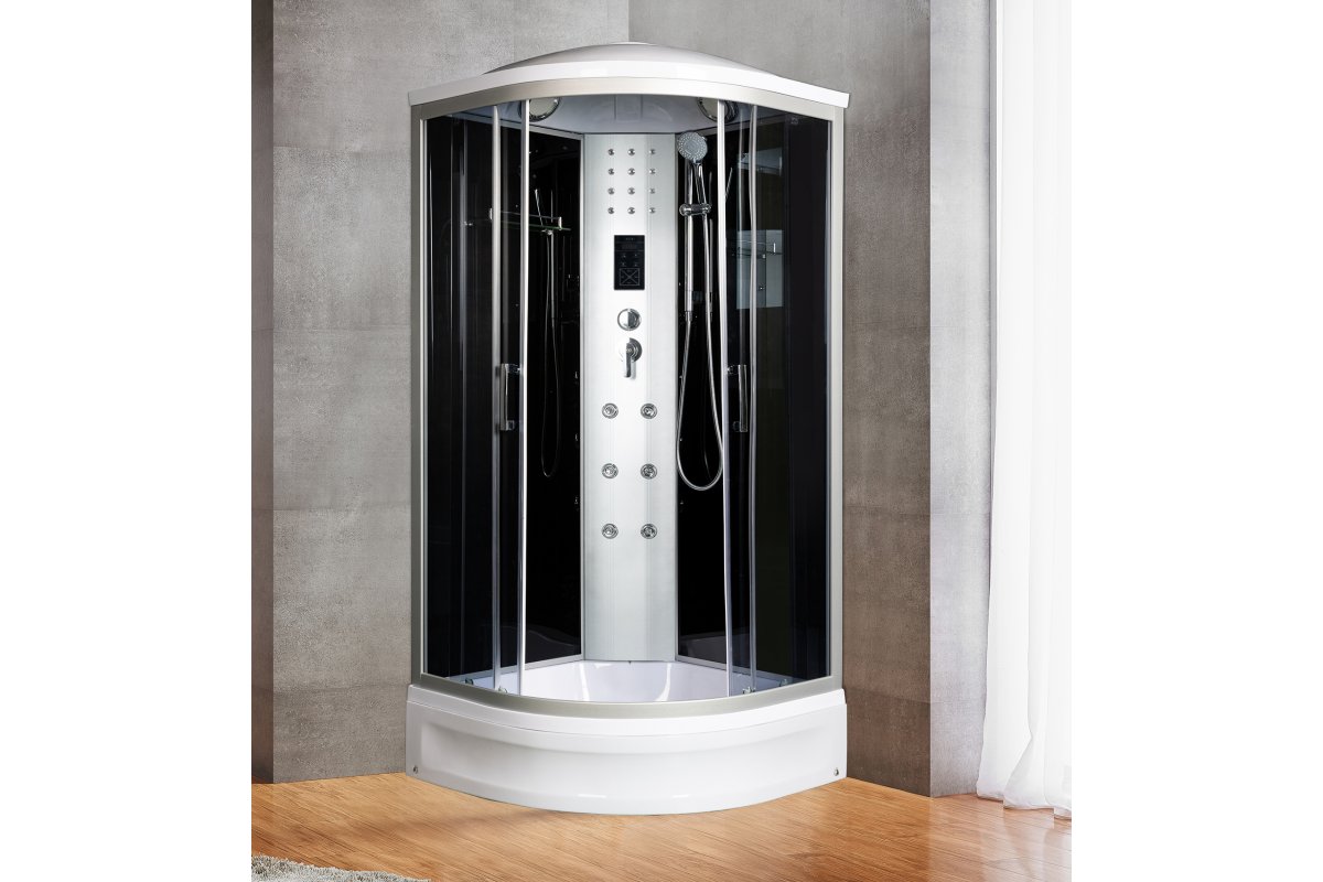 Крыша, верхний душ, "лунный свет" на центральной стойке, динамик, вентилятор, центральная стойка, пульт управления сенсорный, радио, смеситель с переключателем режимов, 6 гидромассажных форсунок, штанга, 3-х режимный ручной душ, зеркало, полочка, сифон, задняя стенка – черное крашеное стекло, передняя часть – тонированное стекло, цвет профиля: матовый хром, толщина стекла: 4 мм, материал полотна двери: стекло, материал профиля: алюминий. Гарантия: 1 год. Страна: Россия.