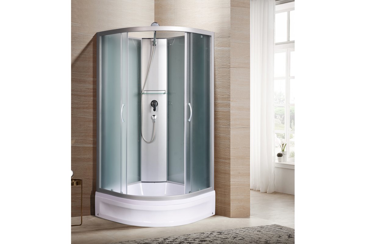 Без крыши, центральная стойка, ручной душ, держатель для лейки, смеситель, полочка, поддон низ.со съемным экраном.