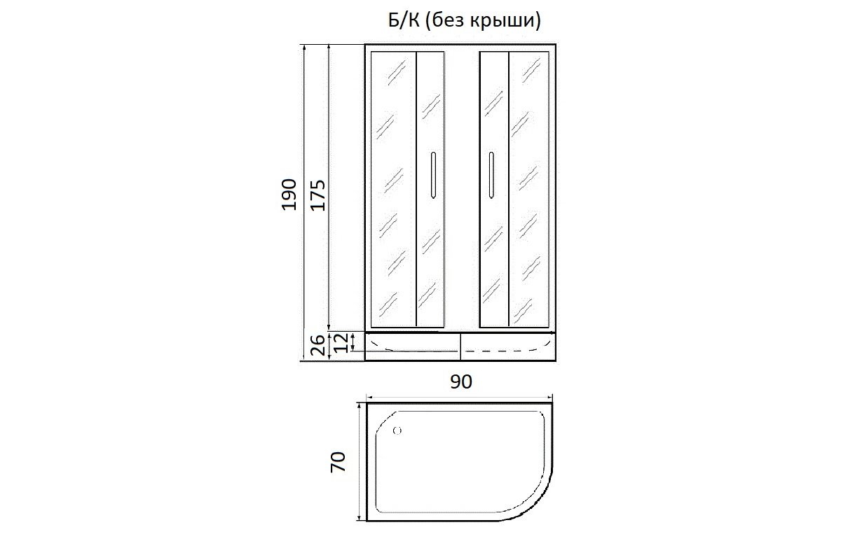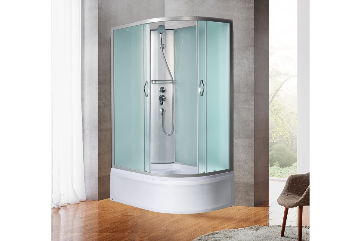 Без крыши, центральная стойка, ручной душ 3-х позиционный, держатель для лейки, смеситель из латуни с керамическим картриджем, полочка, толщина стекла – 4 мм, передняя часть – матовое стекло, задняя стенка – матовое стекло, профиль – матовый хром.
