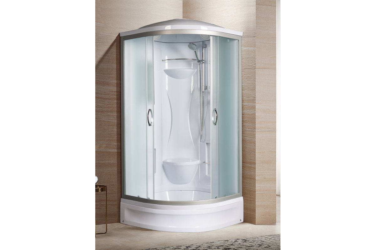 Крыша, верхний душ, штанга, ручной душ, смеситель с переключ.режимов, вентиляц.отв-я 2шт, зеркало, полочки (2шт), сиденье, матовое или тонированное стекло.