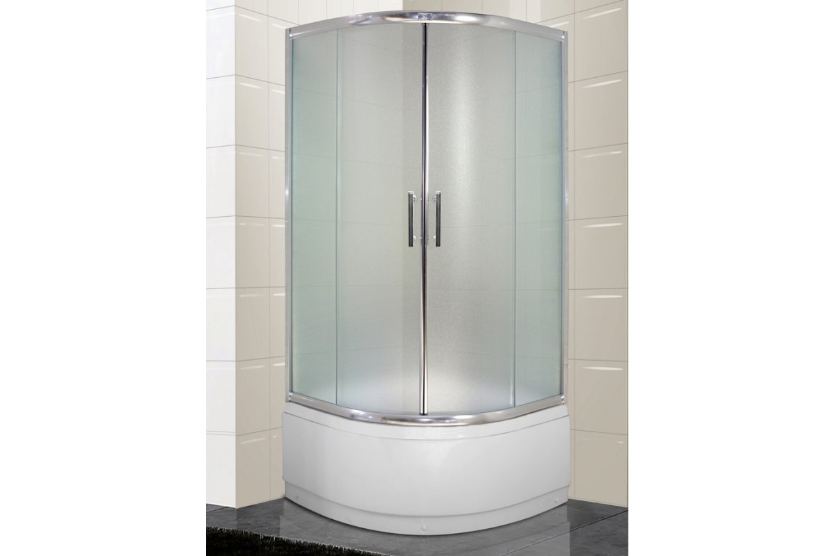 Высокий поддон; сифон с гидрозатвором; алюминиевый профиль, цвет: "глянцевый хром", стекло толщиной 5 мм, фактура: "мороз", двойные верхние ролики, регулировочный пристенный профиль.
