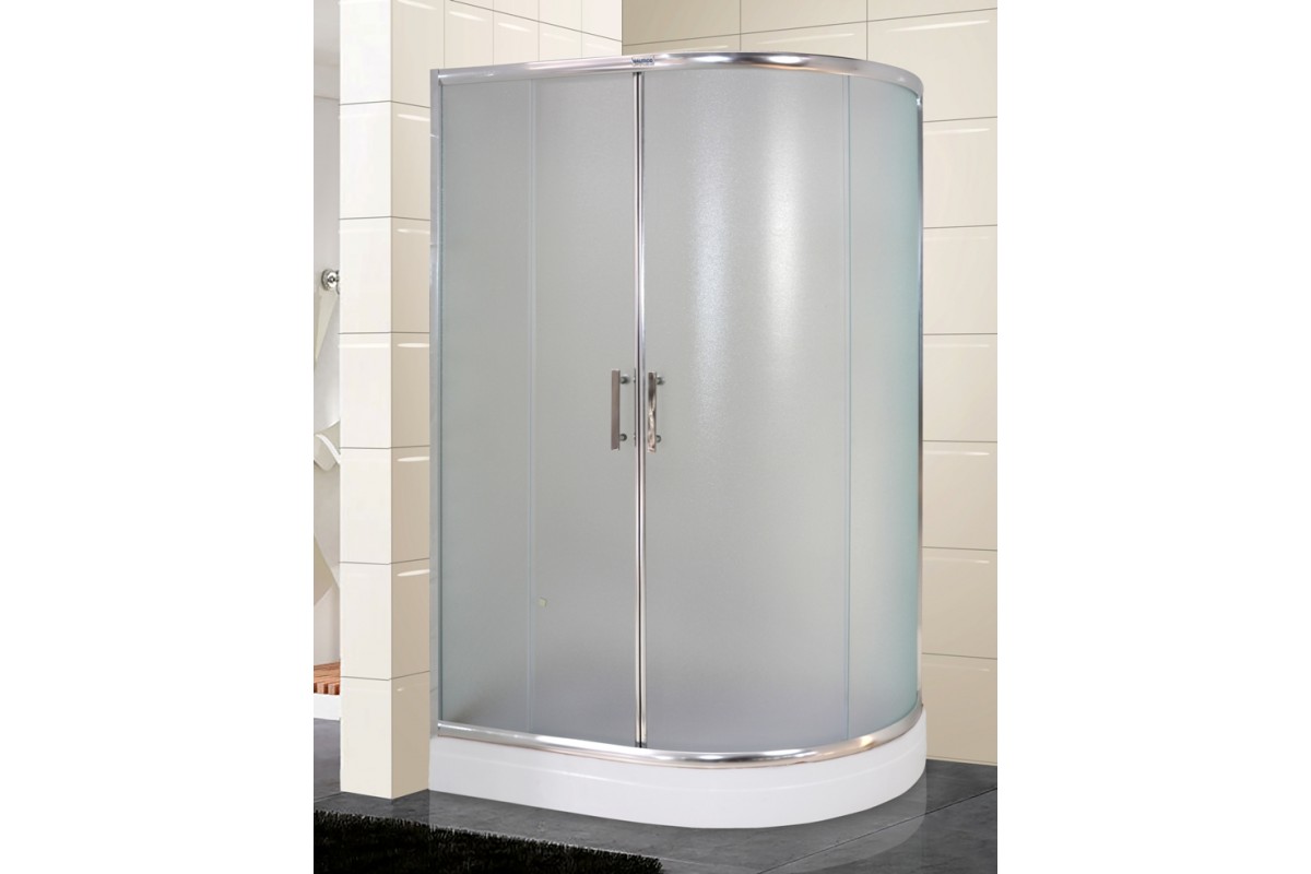 Низкий поддон; сифон с гидрозатвором; алюминиевый профиль, цвет: "глянцевый хром", стекло толщиной 5 мм, фактура: "мороз", двойные верхние ролики, регулировочный пристенный профиль.