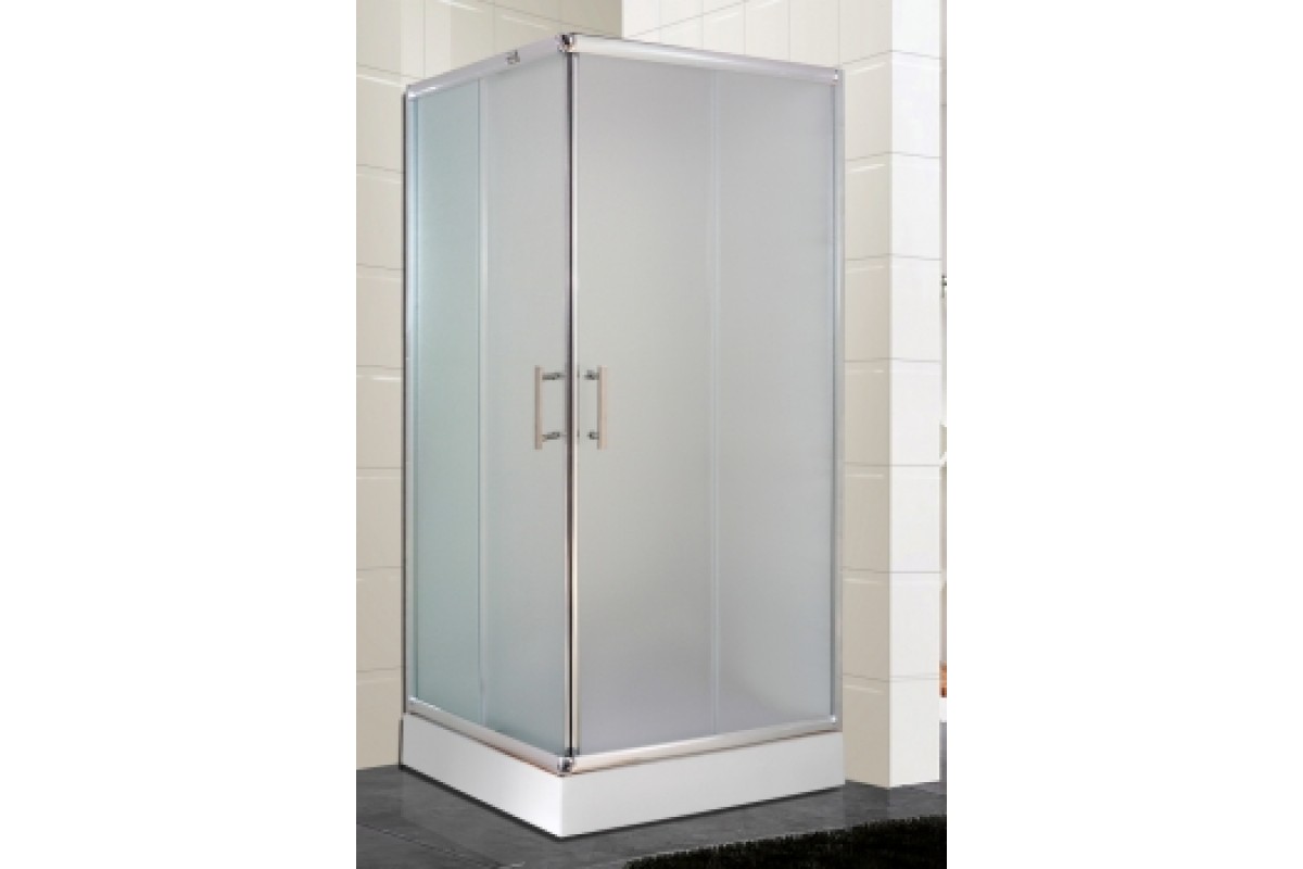 Низкий поддон; сифон с гидрозатвором; алюминиевый профиль, цвет: "глянцевый хром", стекло толщиной 5 мм, фактура: "мороз", двойные верхние ролики, регулировочный пристенный профиль.